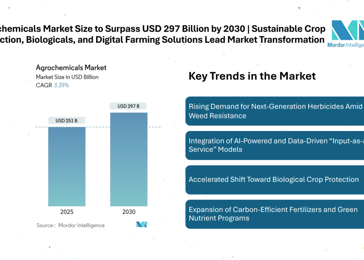 According to a recent analysis by Mordor Intelligence, the agrochemicals market size is expected to grow from USD 251 billion in 2025 to USD 297 billion by 2030, registering a compound annual growth rate (CAGR) of 3.39% during the forecast period. The growth trajectory of the agrochemicals industry is underpinned by the increasing global demand for fertilizers, rapid adoption of biological crop-protection solutions, and the expansion of precision agriculture technologies that improve resource efficiency and sustainability.