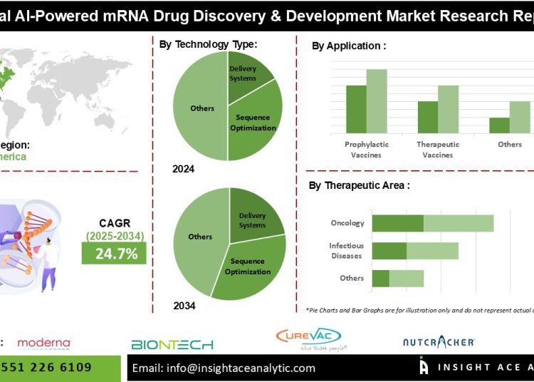 InsightAce Analytic Pvt. Ltd. announces the release of a market assessment report on the “Global AI-Powered mRNA Drug Discovery & Development Market Size, Share & Trends Analysis Report By Application (Prophylactic Vaccines, Therapeutic Vaccines, Protein Replacement Therapies, Gene Editing Support), By Therapeutic Area (Infectious Diseases, Oncology, Rare Genetic Diseases, Cardiovascular & Metabolic Disorders), By Technology Type (Sequence Optimization, Delivery Systems, Predictive Modeling, Manufacturing Optimization), By End-User (Hospitals & Clinics, Research Organizations, Pharmaceutical Companies) Market Outlook And Industry Analysis 2034”