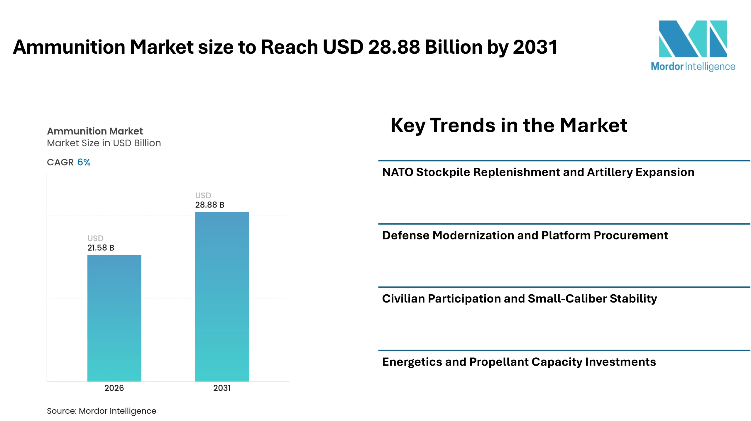 According to Mordor Intelligence, the ammunition market size is expected to grow from USD 21.58 billion in 2026 and is forecasted to reach USD 28.88 billion by 2031, registering a CAGR of 6.00% during the forecast period. Sustained defense procurement programs, artillery stockpile rebuilding initiatives, and modernization plans across allied nations are supporting ammunition market growth.