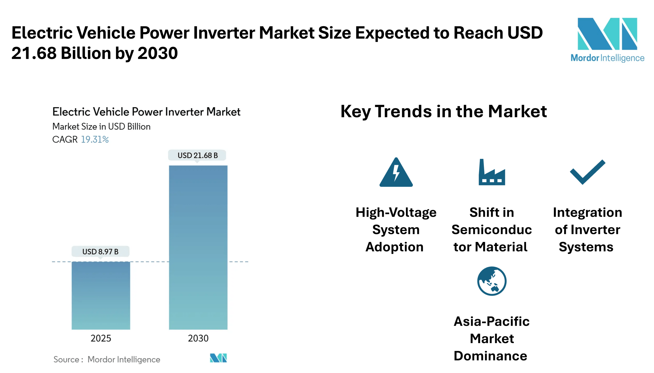 The electric vehicle power inverter market size is estimated at USD 8.97 billion in 2025, and is expected to reach USD 21.68 billion by 2030, at a CAGR of 19.31% during the forecast period (2025-2030).  This robust growth reflects the increasing deployment of electric and hybrid vehicles worldwide and the growing demand for more efficient power-electronics architectures. The term “electric vehicle power inverter market” refers specifically to the market for inverters that convert direct current from the battery to alternating current to drive the traction motor in electric vehicles, and increasingly for bidirectional functions as well.
