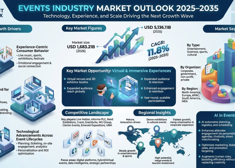 The Events Industry Market is undergoing a remarkable transformation, fueled by rapid technological innovation, shifting consumer expectations, and the increasing importance of experiential engagement. According to recent market insights, the industry is projected to grow significantly from a market size of USD 1,683.21 billion in 2025 to an impressive USD 5,136.11 billion by 2035, registering a robust compound annual growth rate (CAGR) of 11.8% during the forecast period (2025–2035).