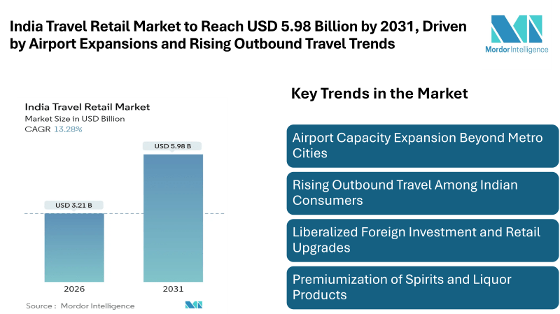 According to Mordor Intelligence, the India travel retail market was valued at USD 2.83 billion in 2025 and estimated to grow from USD 3.21 billion in 2026 to reach USD 5.98 billion by 2031, at a CAGR of 13.28%. Several factors are contributing to this expansion, including upgrades to airport infrastructure, increasing disposable income among the middle class, liberalized foreign investment regulations, and rising outbound travel by Indian consumers.