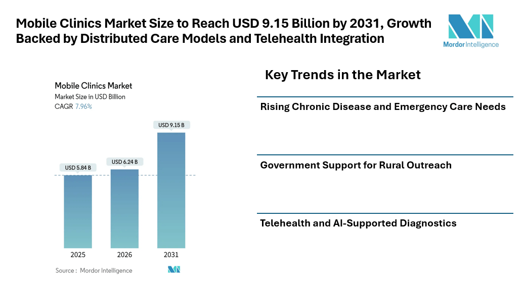 According to Mordor Intelligence, the mobile clinics market size is projected to grow from USD 5.84 billion in 2025 to USD 6.24 billion in 2026 and is expected to reach USD 9.15 billion by 2031, registering a CAGR of 7.96% during the forecast period.