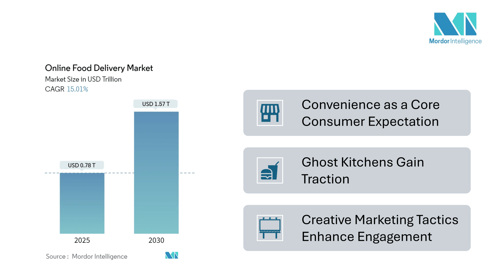 The global online food delivery market size is projected to grow from USD 0.78 trillion in 2025 to USD 1.57 trillion by 2030, reflecting a robust compound annual growth rate (CAGR) of 15.01% over the forecast period (2025-2030). This sharp rise is largely fueled by shifts in consumer behavior, widespread smartphone usage, and increasing expectations for speed, convenience, and choice in meal consumption.