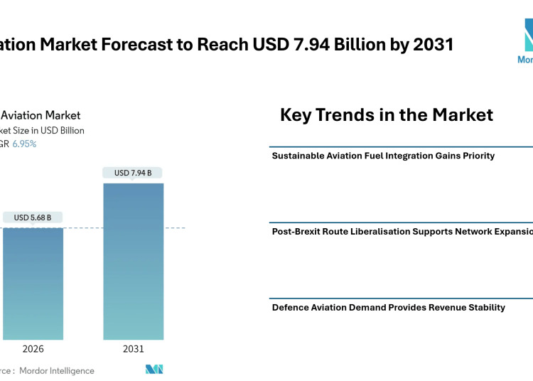 According to Mordor Intelligence, the UK aviation market size was valued at USD 5.68 billion in 2026 to USD 7.94 billion by 2031, reflecting a CAGR of 6.95% during the forecast period. This outlook underlines a balanced recovery supported by civil aviation demand, government defence spending, and policy-driven sustainability goals.